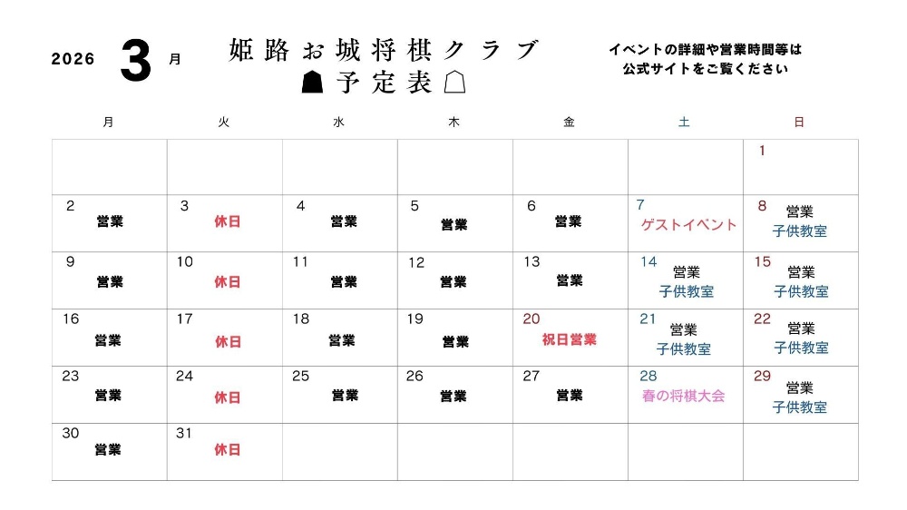 | 3月27日 | 姫路・お城将棋クラブ 春の将棋大会 |